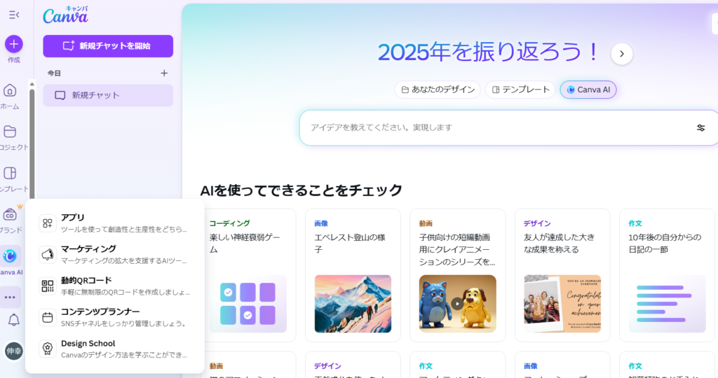 まず、Canvaを開き左側の「・・・」の上にカーソルを合わせます。するとアプリなどのツールが表示されます。