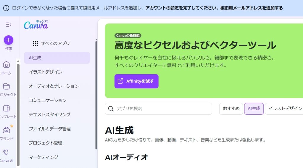 アプリを選択し、AI生成を選択します。